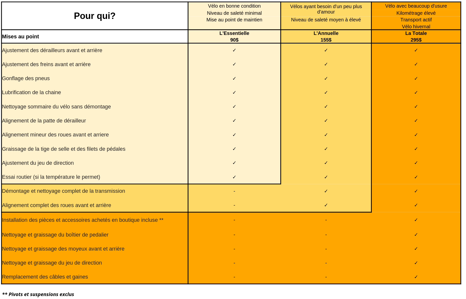 Voici les entretiens complets offerts par Vélozophie. Vous pouvez personnaliser votre entretien en y ajoutant des items de notre service “À la carte” afin de combler tous les besoins de votre vélo.
